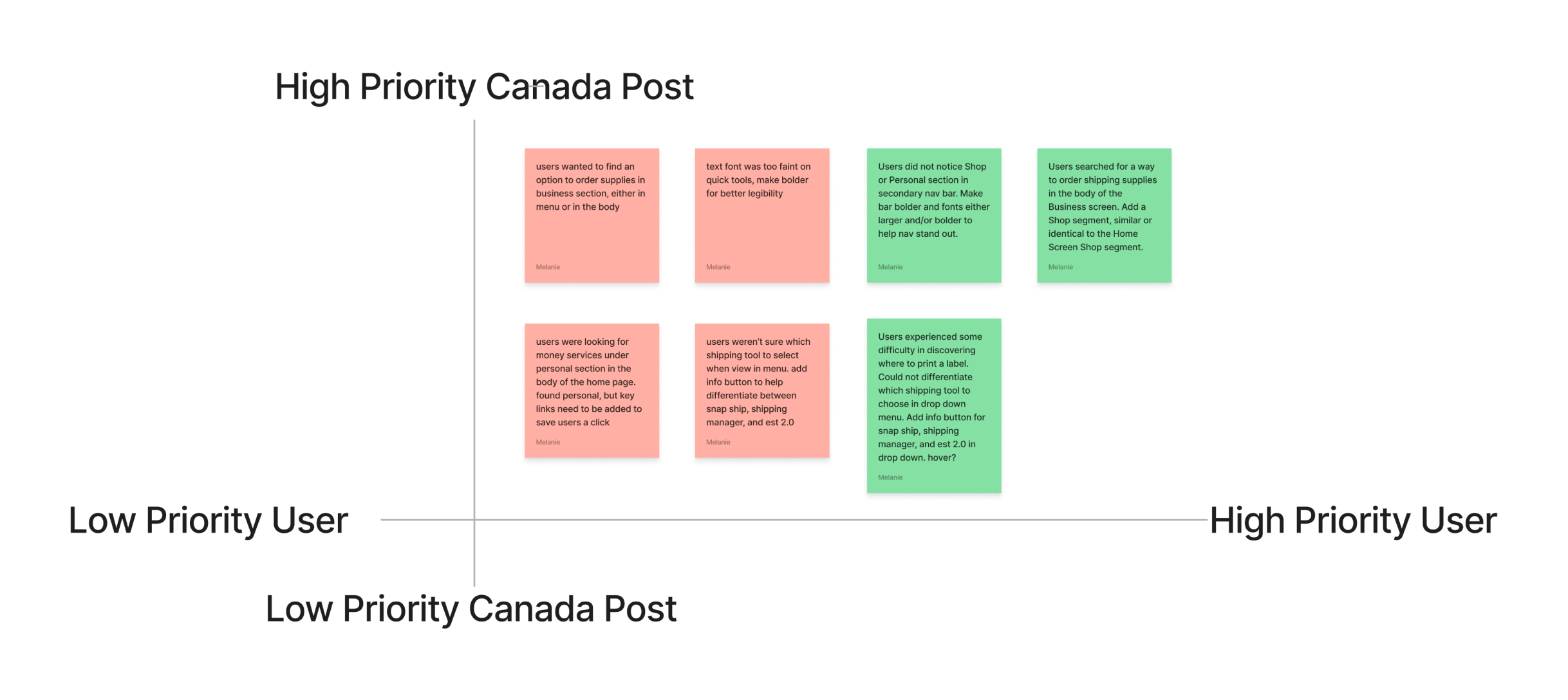Closed card sorting was employed to initiate the navigation redesign process. I documented Canada Post's primary and secondary screen navigation, including the footer. The cards were then shuffled and rearranged, with different colored sticky notes used to distinguish global, primary, secondary, and tertiary navigation.