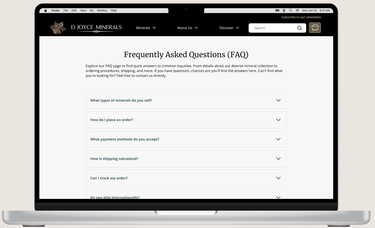 Solution: Changing the label to "Shop" ensures users have a clear understanding of what to expect within this dropdown menu. Since the website mainly sells minerals, it's crucial to use explicit language indicating the shopping area.